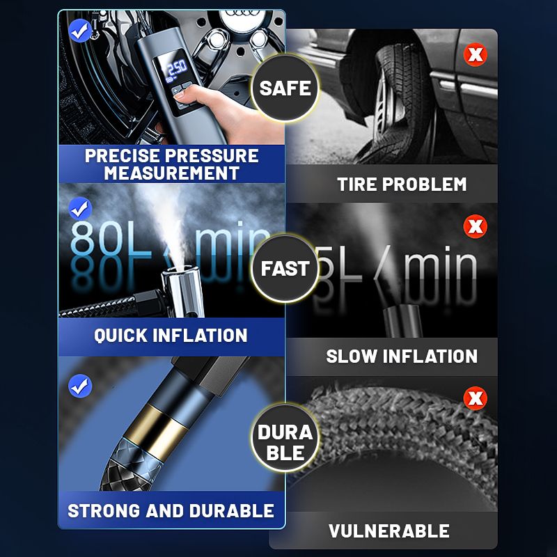 【20s Fast Inflation & SOS Rescue Key 】 Real-time understanding of tire pressure status, accurate pressure measurement with 0 error, powerful inflation in 10~20s, special SOS rescue key setting to ensure travel safety.