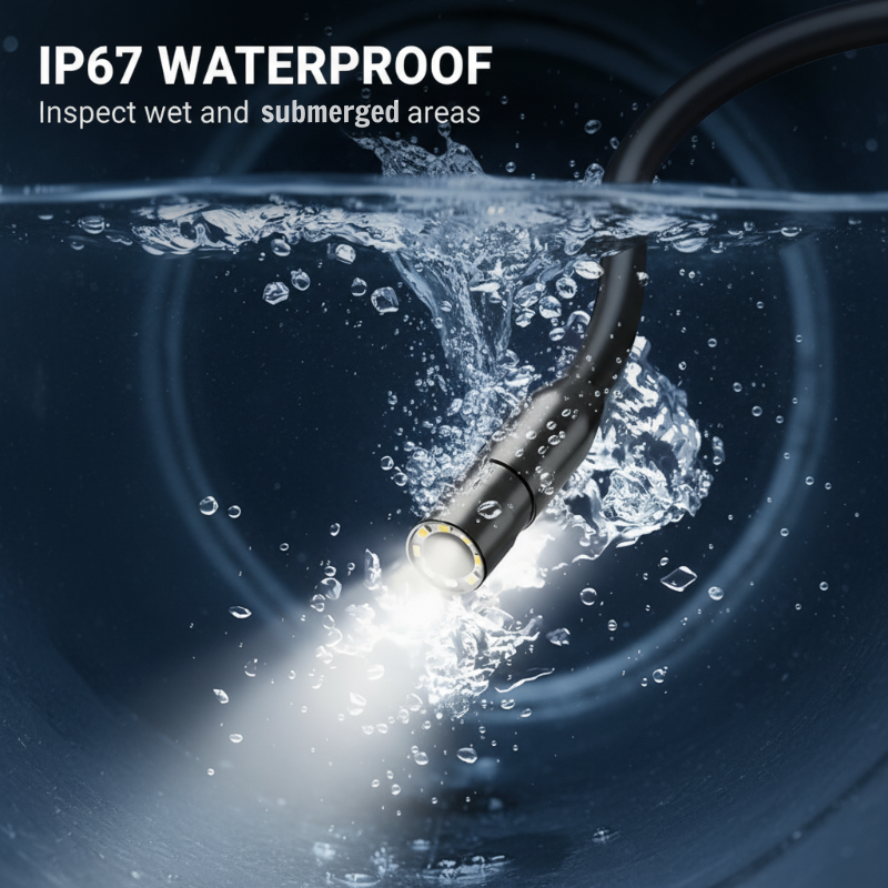 ROBUST IP67 WATERPROOF DESIGN - The camera probe boasts an IP67 waterproof rating, allowing for reliable operation in wet or submerged conditions. This durability ensures consistent performance in challenging liquid environments, making it ideal for plumbing and aquatic inspections.