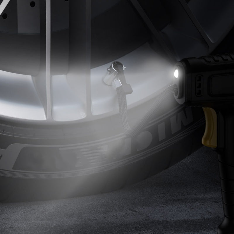 INTEGRATED LED LIGHT - A built-in bright LED light provides clear visibility for nighttime operations. Easily locate the valve stem and inflate tires safely in the dark or during low-light emergencies without needing a separate flashlight.