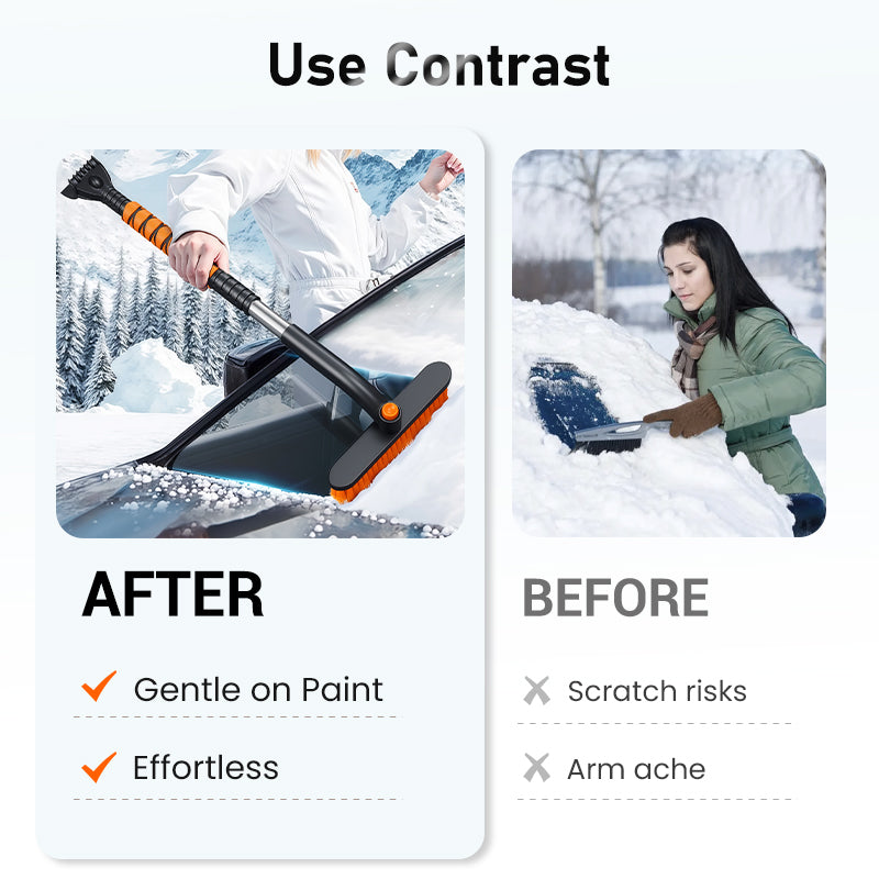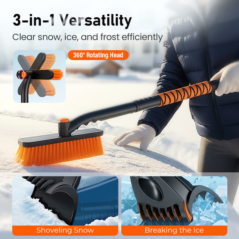 ADJUSTABLE ANGULAR BRUSH HEAD - The brush head offers 360° rotation, allowing secure fixation at various angles. This flexible design enables users to reach awkward areas and apply optimal pressure, enhancing the ease and effectiveness of snow and ice clearing on diverse vehicle contours.